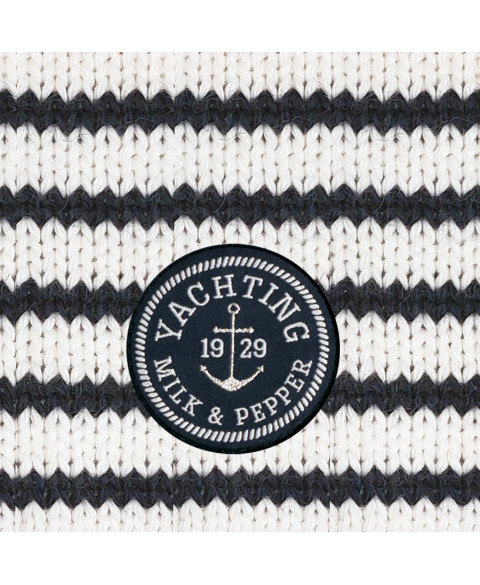Kleiner, gewebter Aufkleber mit dem Aufdruck „Yachting“ im unteren Rückenbereich